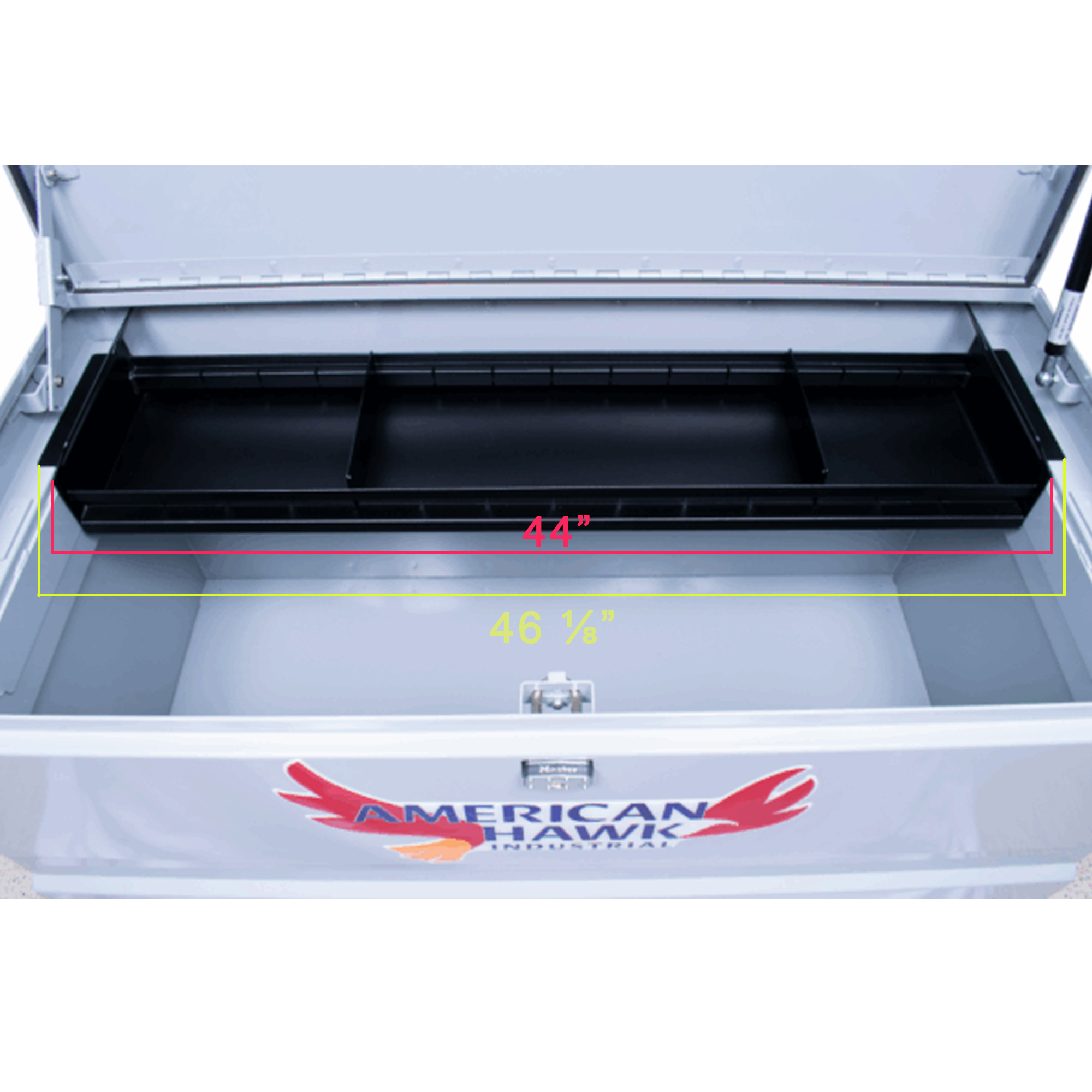Replacement jobsite box tray designed to fit the American Hawk 48″ x 24″ jobsite toolbox. This tray may also fit other major brand job boxes that meet the required dimensions, with an outside tray length of 46 ⅛” and an inside grab span of 44″.